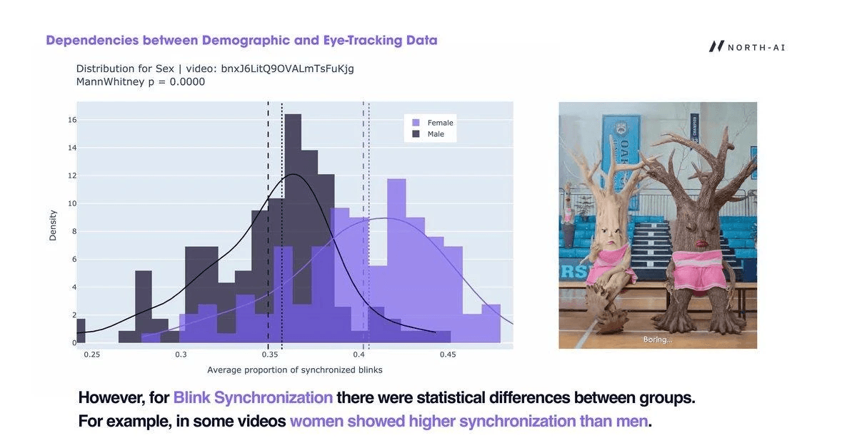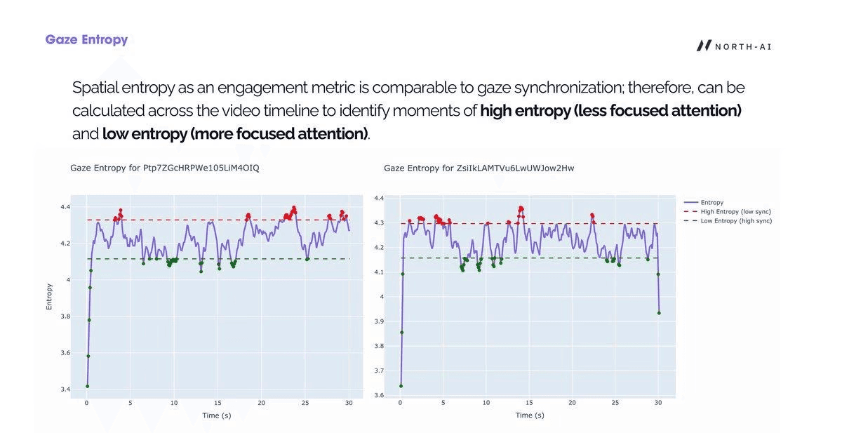 A neuroscientific study conducted by North AI. 301 participants across the US and Canada were eye-tracked while watching 6 promotional videos. Gaze synchronisation and spatial entropy data revealed which moments engage audiences — and which don't.