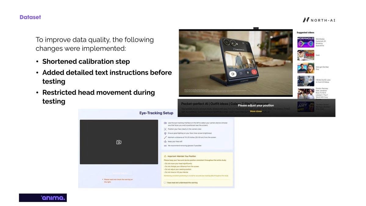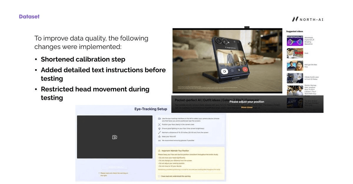 01 — Test design critically affects data quality. Remote, reward-motivated participants produce inconsistent eye-tracking data without proper UX controls. Shortened calibration, explicit instructions, and head movement restrictions substantially improved signal quality. This finding has direct implications for how remote eye-tracking studies should be designed at scale.