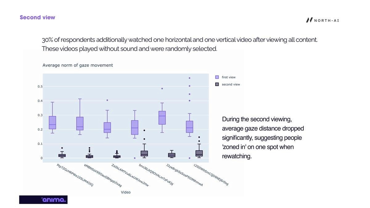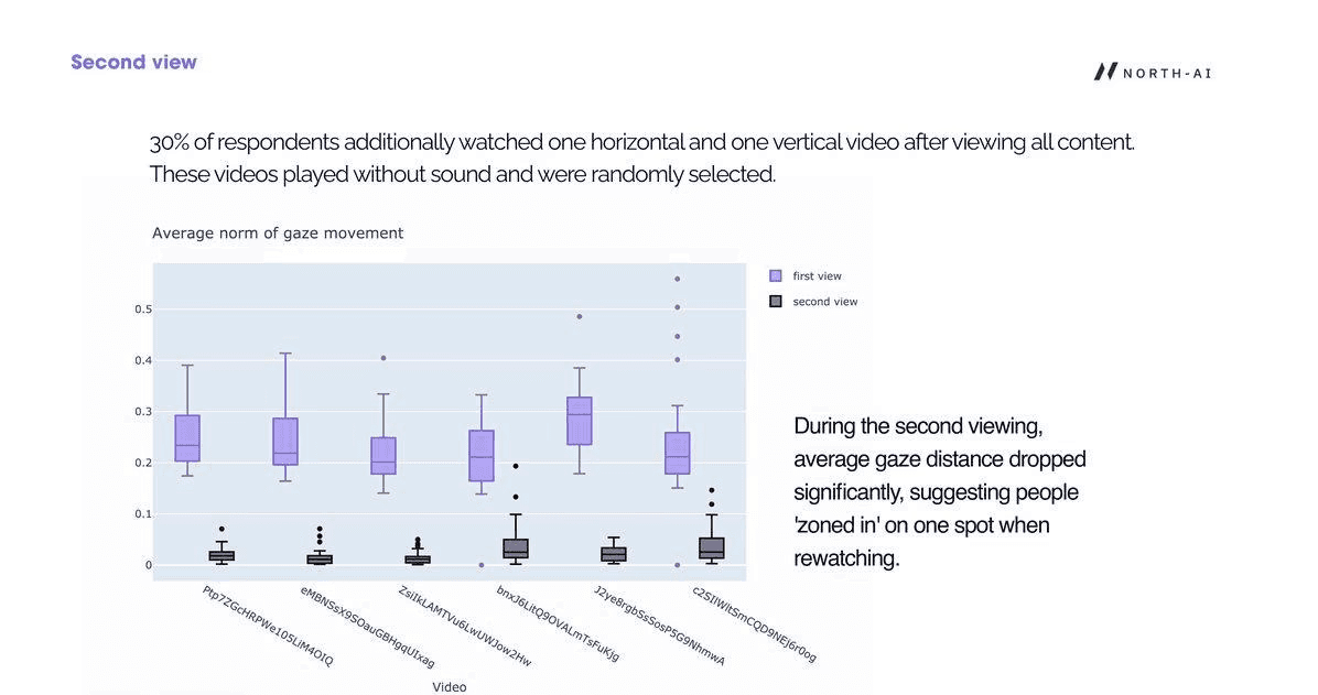 "On second viewing, average gaze distance dropped significantly, suggesting people 'zoned in' on one spot when rewatching. First-view gaze data is therefore the reliable signal for engagement measurement."