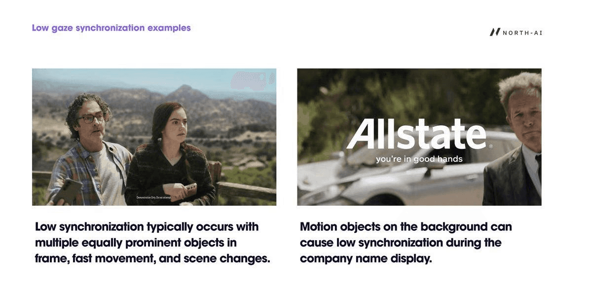 Fig. 12 — Low gaze synchronisation examples. Left: multiple people in frame with similarly weighted visual prominence. Right: moving background elements during brand name display (Allstate) pull attention away from the brand identifier. Both scenarios scatter gaze across the frame.