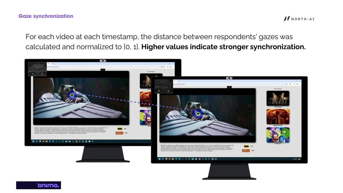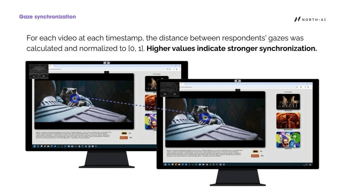 Fig. 10 — Gaze synchronisation visualised across two screens watching the same content. The diagonal dotted line connects the two gaze points — shorter distance = higher synchronisation. When both viewers fixate the same element, the line disappears.