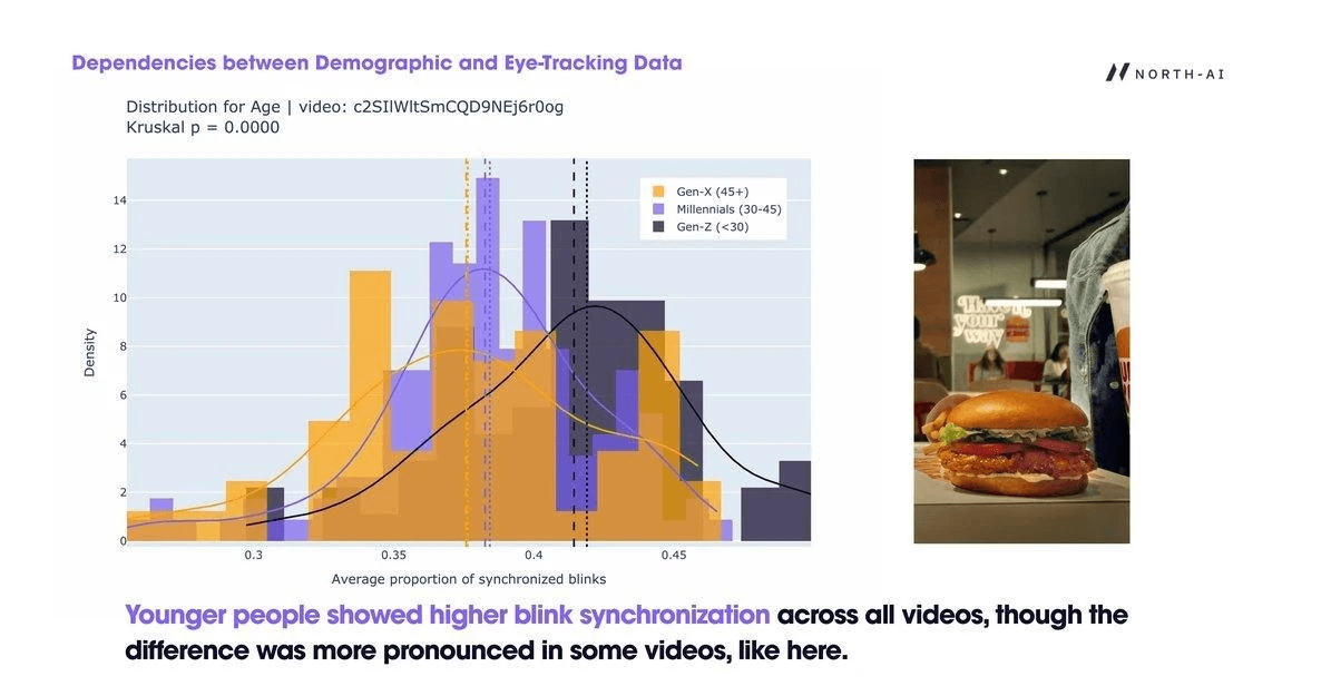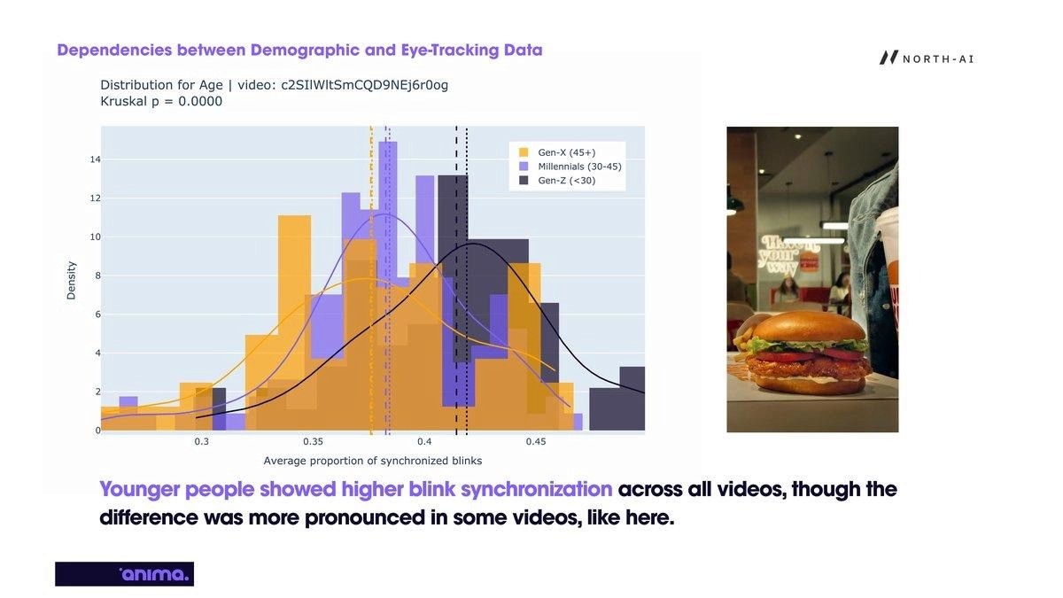 02 — Demographics affect blink synchronisation but not gaze patterns. Where people look and how they track video content is consistent across age, sex, and country. This means engagement measurement from eye-tracking is broadly generalisable. However, blink synchronisation — a measure of shared emotional reaction — does vary by demographic group, particularly by age. Younger audiences show higher synchronisation, indicating greater neural reactivity to advertising and socially relevant content.
