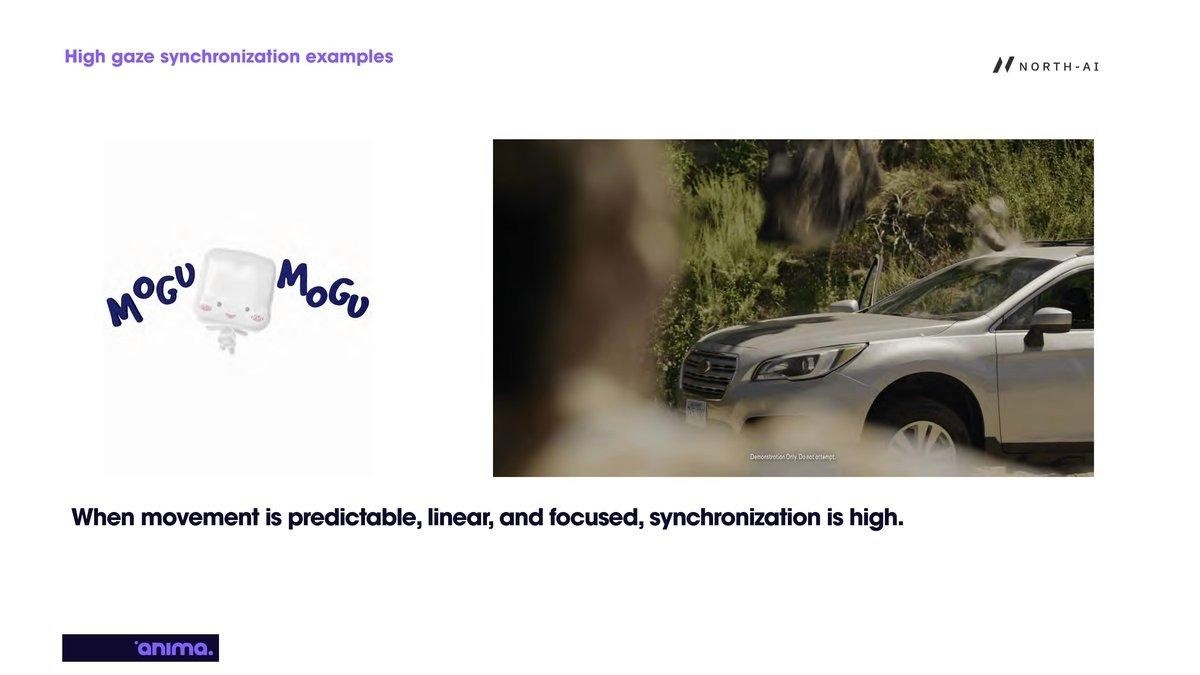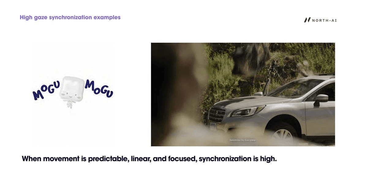 High synchronisation occurred when visual movement was predictable, linear, and focused. Content with a clear singular moving element — a product, a character in motion, a single focal point — produced the strongest gaze alignment across all viewers.