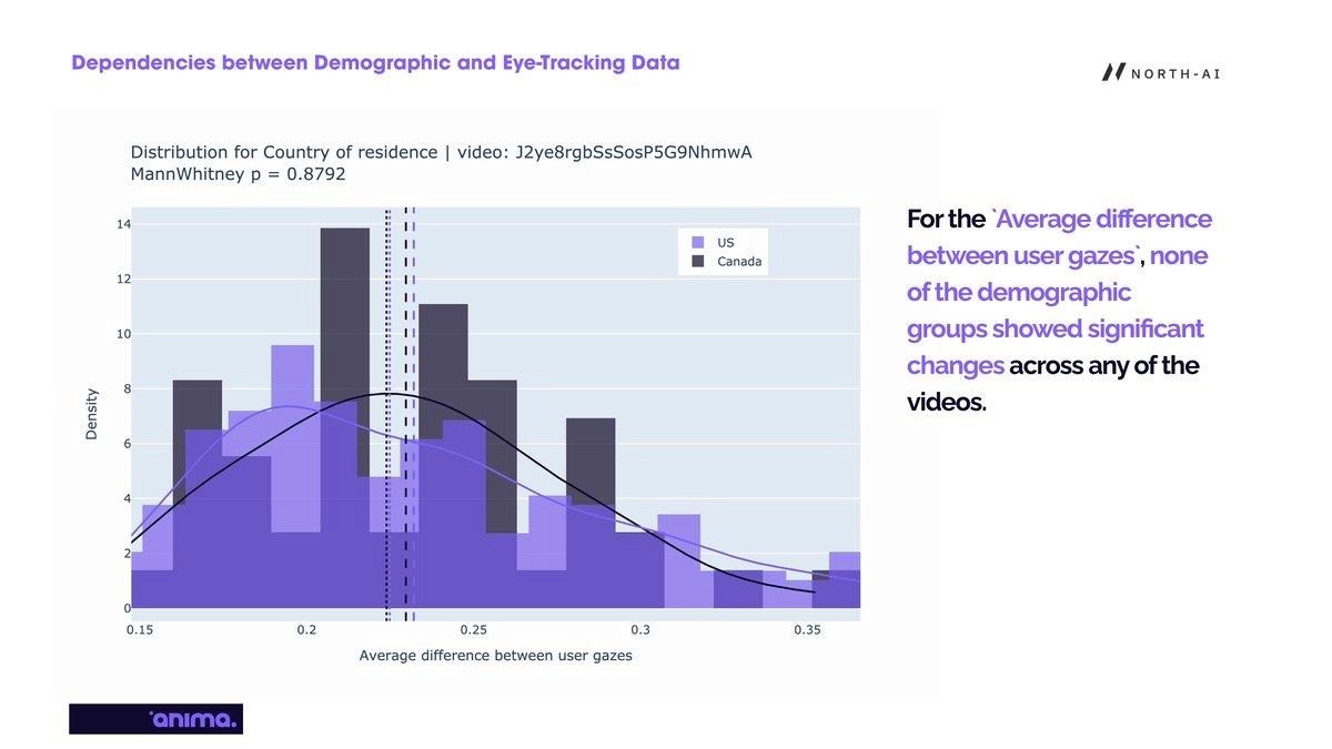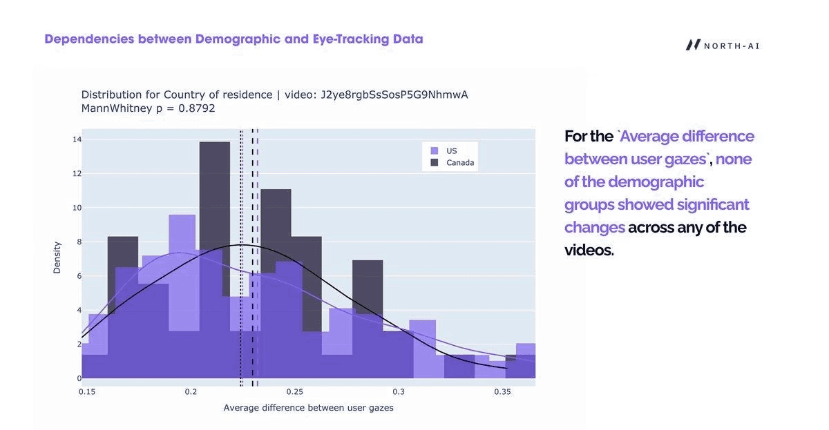 Fig. 6 — Distribution of average gaze difference between US and Canadian respondents for one video (Mann-Whitney p=0.8792). The near-identical distributions confirm that country of residence does not affect where or how participants look at video content.