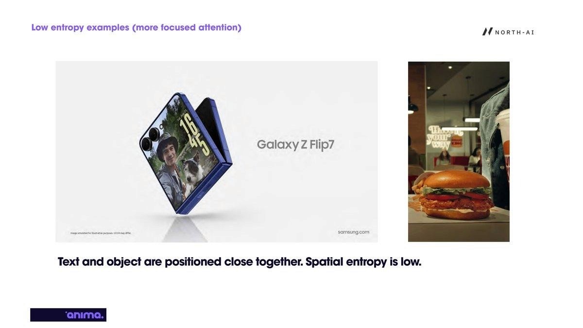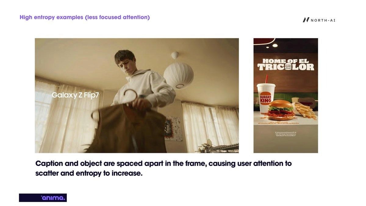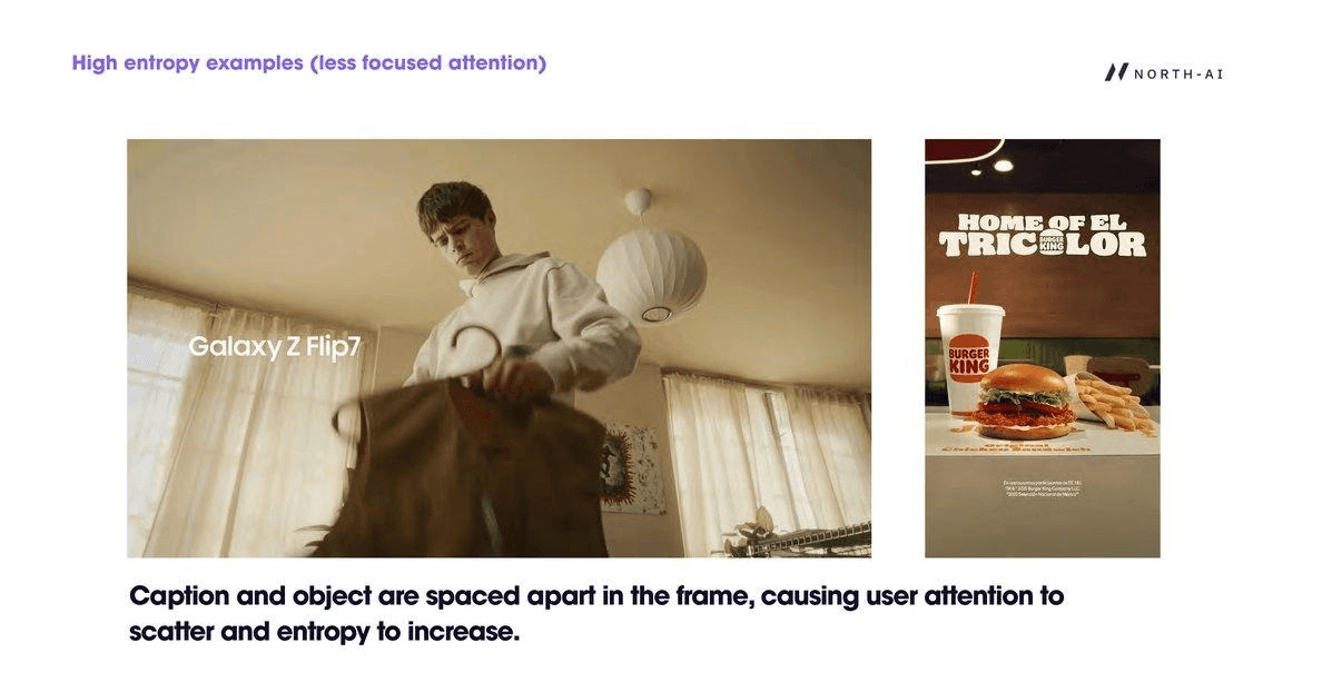 Entropy rises when caption and object are spatially separated in the frame. Viewers scan between the product or scene element and the text overlay, increasing the spatial spread of gaze across the frame.