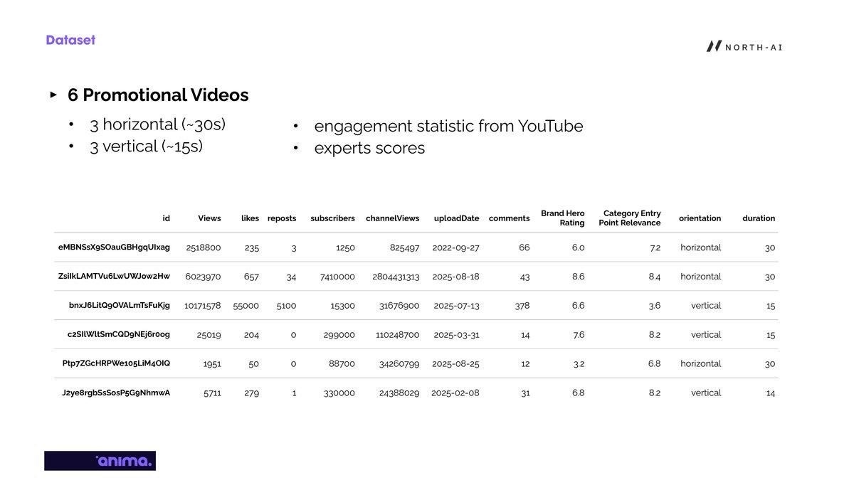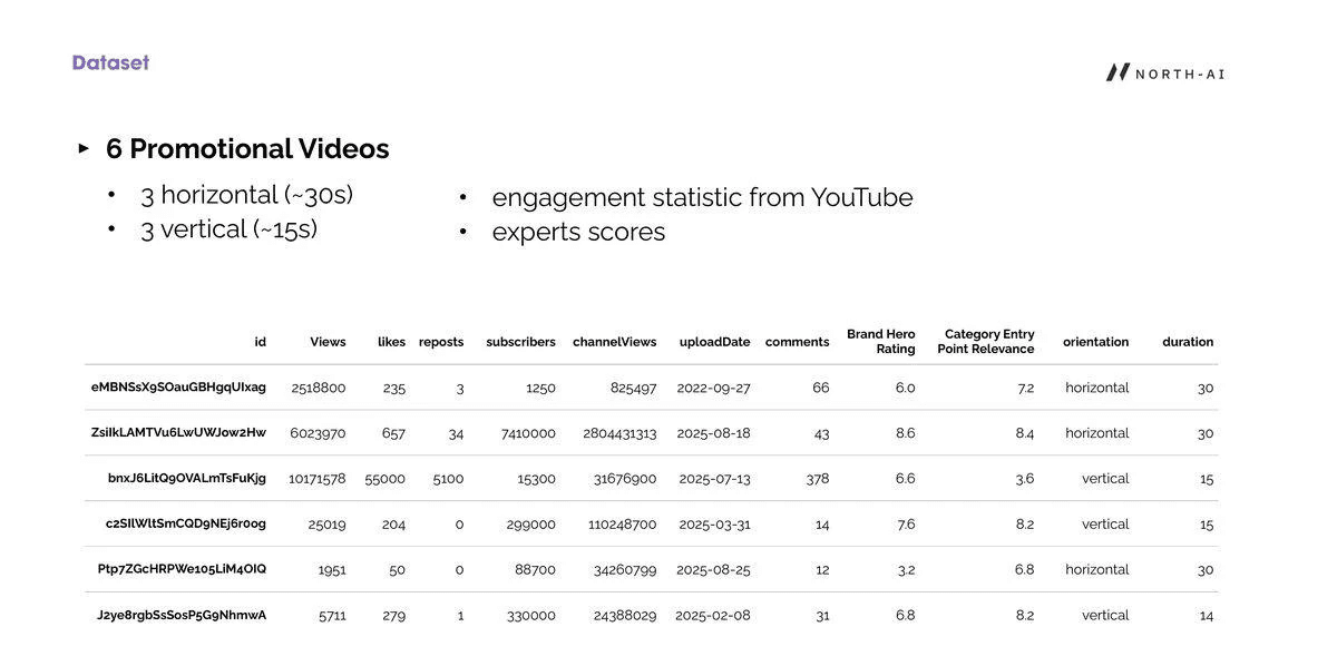 Fig. 2 — Dataset of 6 promotional videos with YouTube engagement metrics and expert scores. Videos range from 1,951 views to over 10 million views, covering both horizontal (30s) and vertical (15s) formats.