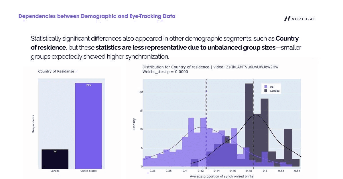 Fig. 9 — Country of residence comparison for blink synchronisation in one video (Welch's t-test p=0.0000). Canadian respondents showed higher synchronisation, but this result is less reliable due to substantially unequal group sizes (56 Canada vs 245 US). Smaller groups tend to show higher synchronisation as an artefact of group size.