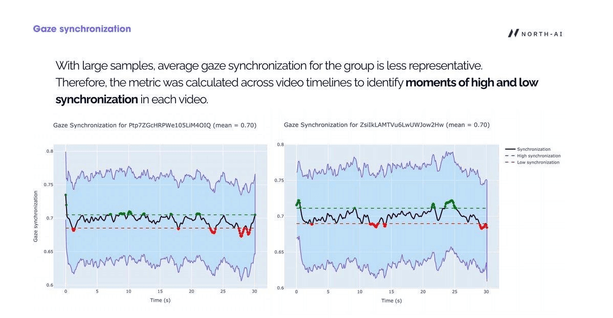 Gaze synchronisation measures the degree to which different viewers are looking at the same point on screen at the same moment. When synchronisation is high, all viewers attend to the same element — indicating clear visual direction and focused engagement. When it is low, viewers are looking at different things, which indicates competing visual stimuli, fast movement, or unclear content direction. It is calculated by measuring the spatial distance between viewer gazes at each video timestamp, normalised to a 0–1 scale.