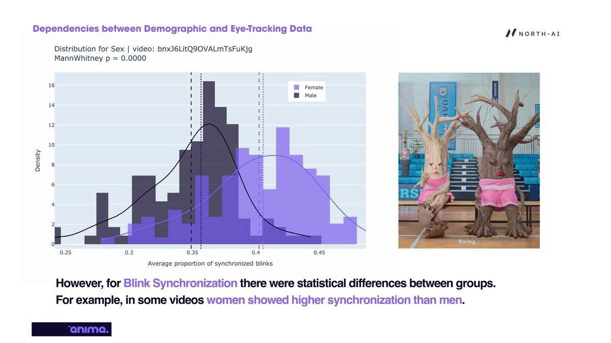 Blink synchronisation — the degree to which participants' blinks align in time — showed significant demographic differences. This metric is a proxy for shared emotional or cognitive reaction: when people blink together, they are responding to the same stimulus at the same moment.