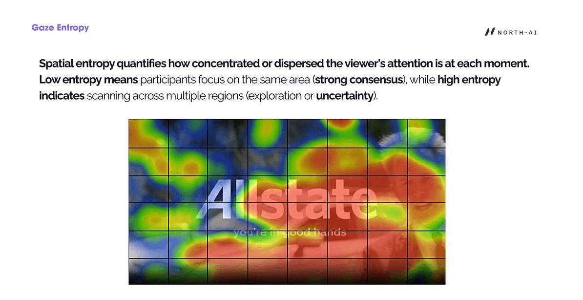 Fig. 14 — Gaze entropy visualised as a grid overlay on a frame from an Allstate ad. Each grid cell shows the local entropy of viewer attention. Central cells (brand name area) show high entropy — viewers' gazes are scattered — despite the brand being prominently placed. This indicates the background motion is fragmenting attention during the brand reveal.