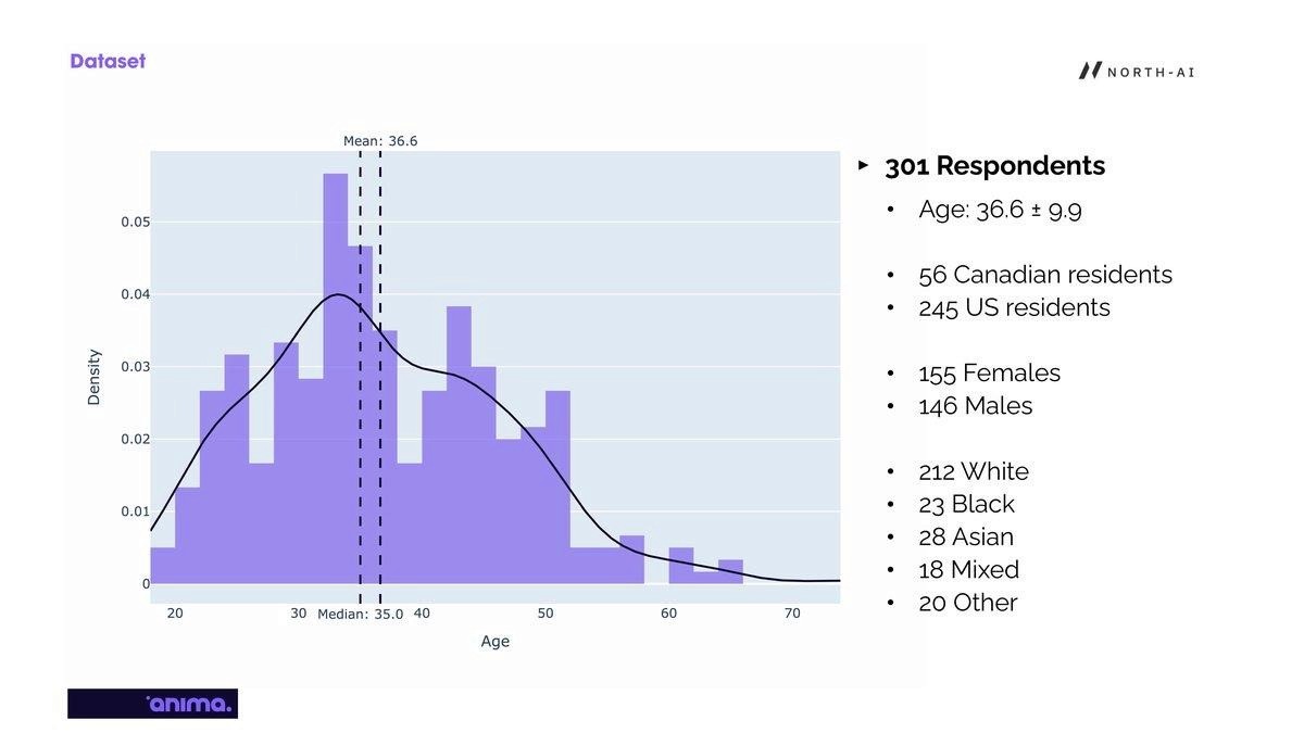 301 respondents completed the study. Mean age was 36.6 (±9.9), with a median of 35. 245 were US residents and 56 were Canadian. The sample was 155 female and 146 male, with a mix of ethnic backgrounds.