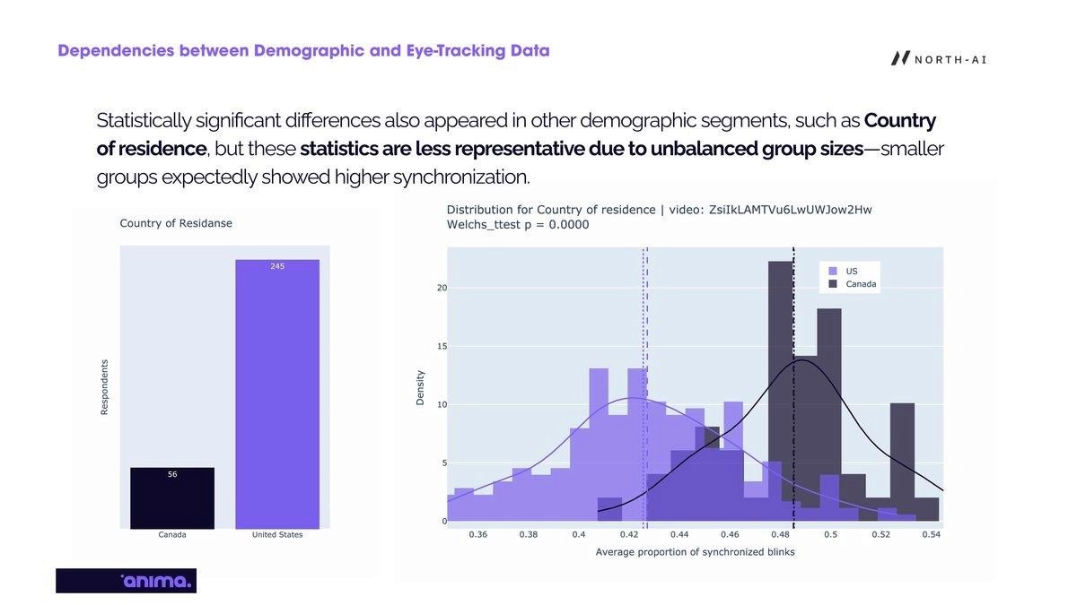 Gaze patterns — where viewers look and how they track content — are consistent across all demographic groups tested. Country of residence, sex, and age did not significantly affect gaze behaviour. However, blink synchronisation varied significantly by age and sex. Younger viewers (Gen-Z) showed higher blink synchronisation than older groups, indicating greater neural reactivity to advertising content. Female respondents showed higher synchronisation than male respondents in several videos. These demographic differences should be accounted for when interpreting synchronisation-based engagement scores.