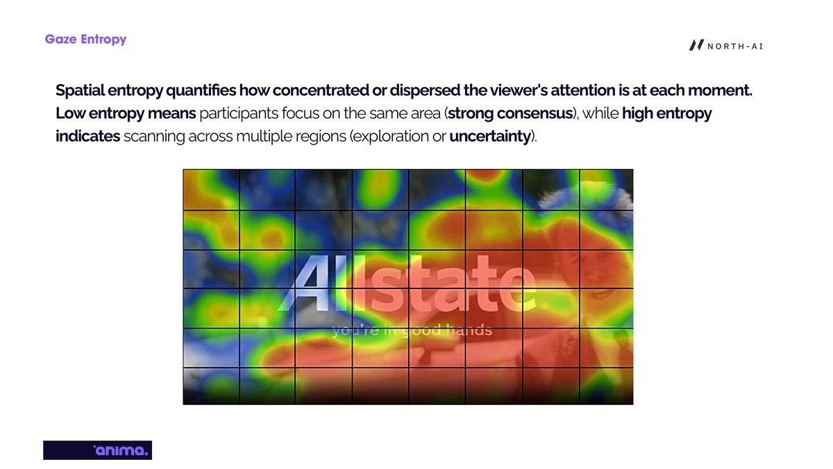 Spatial entropy quantifies how concentrated or dispersed viewer attention is at each moment across the frame. Low entropy means all viewers's gazes are clustered in the same region — indicating focused, consensus attention. High entropy means gazes are scattered across multiple frame regions — indicating exploration, uncertainty, or competing visual elements. Unlike gaze synchronisation, entropy captures dispersal of attention regardless of whether different viewers are looking at the same spot.