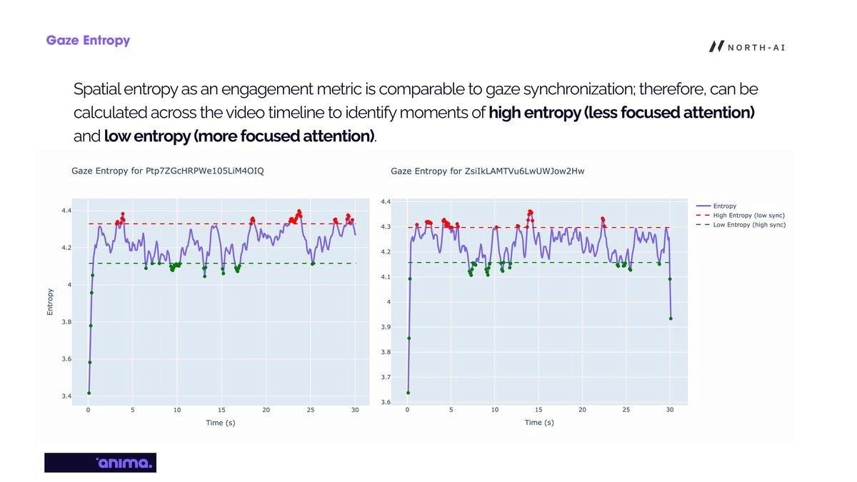 Like synchronisation, entropy was calculated at each timestamp to identify specific moments where viewer attention was focused vs dispersed. The two metrics are complementary — they often identify the same problem moments but can diverge in certain content conditions.