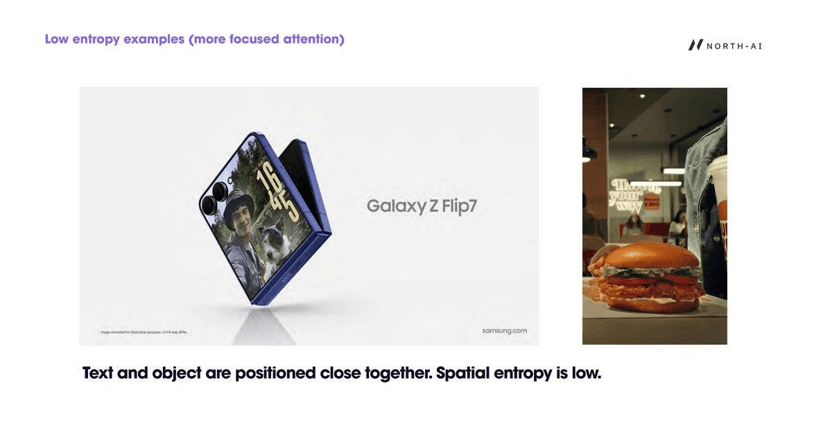 Fig. 17 — High entropy examples. Galaxy Z Flip7 ad (lifestyle version): brand name positioned in lower left while the human subject occupies the centre — viewers split attention between the two. Burger King poster: text and product separated vertically, causing scanning behaviour that increases entropy.