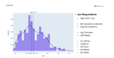 301 respondents completed the study. Mean age was 36.6 (±9.9), with a median of 35. 245 were US residents and 56 were Canadian. The sample was 155 female and 146 male, with a mix of ethnic backgrounds.