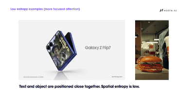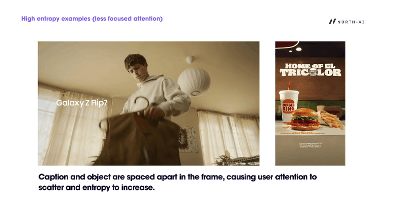 Entropy rises when caption and object are spatially separated in the frame. Viewers scan between the product or scene element and the text overlay, increasing the spatial spread of gaze across the frame.