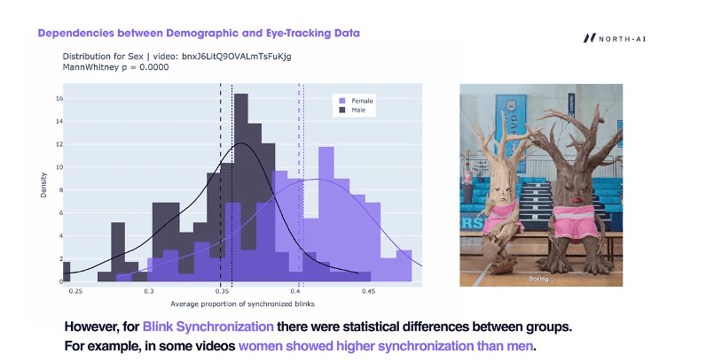 Blink synchronisation — the degree to which participants' blinks align in time — showed significant demographic differences. This metric is a proxy for shared emotional or cognitive reaction: when people blink together, they are responding to the same stimulus at the same moment.