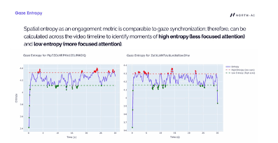 Spatial entropy quantifies how concentrated or dispersed viewer attention is at each moment across the frame. Low entropy means all viewers's gazes are clustered in the same region — indicating focused, consensus attention. High entropy means gazes are scattered across multiple frame regions — indicating exploration, uncertainty, or competing visual elements. Unlike gaze synchronisation, entropy captures dispersal of attention regardless of whether different viewers are looking at the same spot.