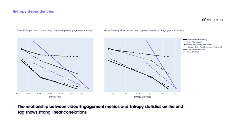 "The relationship between video engagement metrics and entropy statistics on the end tag shows strong linear correlations. Lower entropy on the pack shot — more focused attention on the brand at the critical closing moment — predicts higher views, likes, and expert ratings."