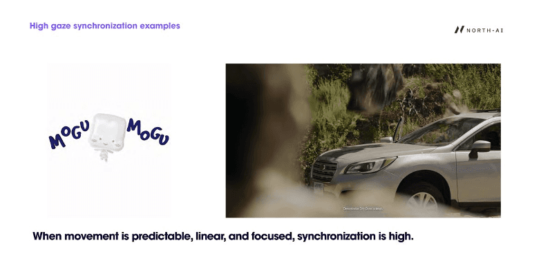 High synchronisation occurred when visual movement was predictable, linear, and focused. Content with a clear singular moving element — a product, a character in motion, a single focal point — produced the strongest gaze alignment across all viewers.