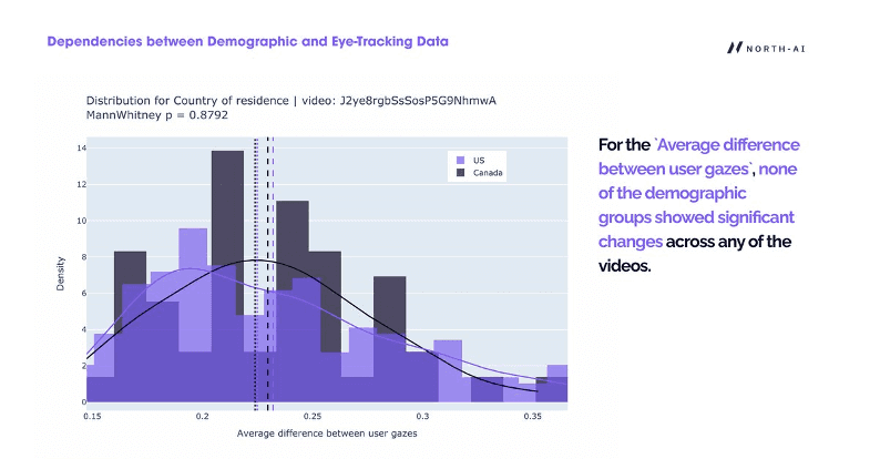 Fig. 6 — Distribution of average gaze difference between US and Canadian respondents for one video (Mann-Whitney p=0.8792). The near-identical distributions confirm that country of residence does not affect where or how participants look at video content.