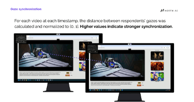 Gaze synchronisation measures how similarly different viewers are looking at the same point on screen at the same moment. When gaze is synchronised, all viewers are attending to the same thing. When it disperses, viewers are looking at different elements — indicating competing stimuli, visual overload, or low content direction.
