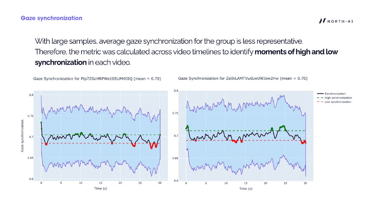 Average gaze synchronisation across the full video provides a single engagement score per video, but masks important variation within the content. The research team calculated synchronisation at each timestamp across the video runtime to identify specific moments of high and low engagement.