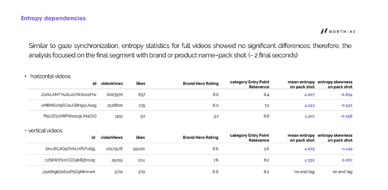 → Low gaze entropy on pack shot predicts higher views | → More negative entropy skewness = more views & likes |