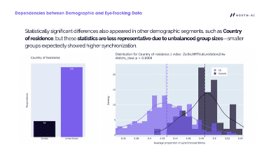 Gaze patterns — where viewers look and how they track content — are consistent across all demographic groups tested. Country of residence, sex, and age did not significantly affect gaze behaviour. However, blink synchronisation varied significantly by age and sex. Younger viewers (Gen-Z) showed higher blink synchronisation than older groups, indicating greater neural reactivity to advertising content. Female respondents showed higher synchronisation than male respondents in several videos. These demographic differences should be accounted for when interpreting synchronisation-based engagement scores.
