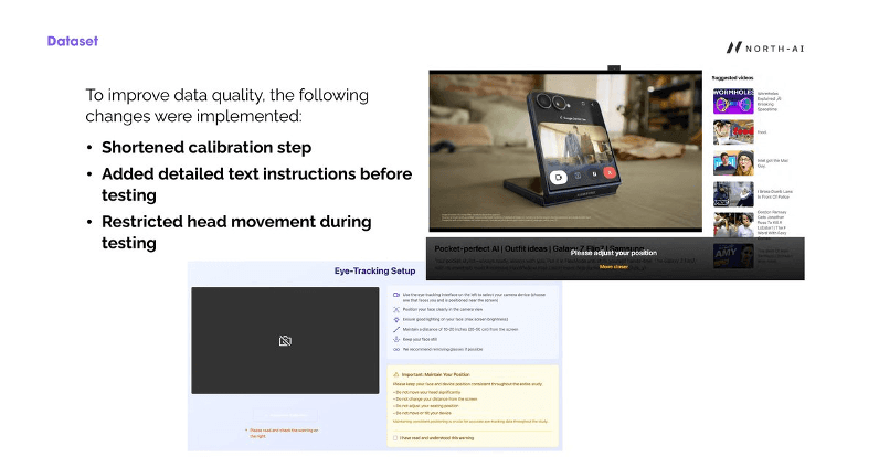 01 — Test design critically affects data quality. Remote, reward-motivated participants produce inconsistent eye-tracking data without proper UX controls. Shortened calibration, explicit instructions, and head movement restrictions substantially improved signal quality. This finding has direct implications for how remote eye-tracking studies should be designed at scale.