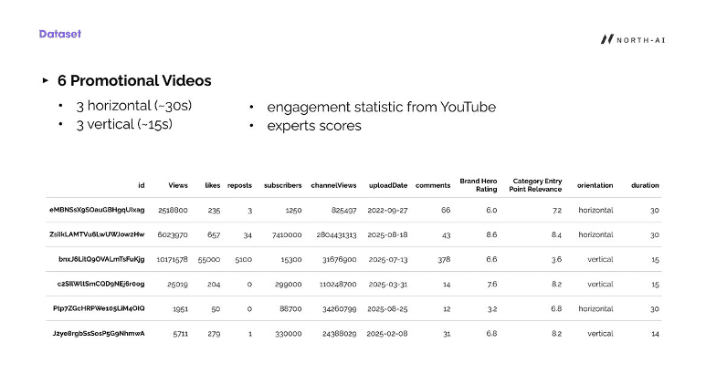 Fig. 2 — Dataset of 6 promotional videos with YouTube engagement metrics and expert scores. Videos range from 1,951 views to over 10 million views, covering both horizontal (30s) and vertical (15s) formats.