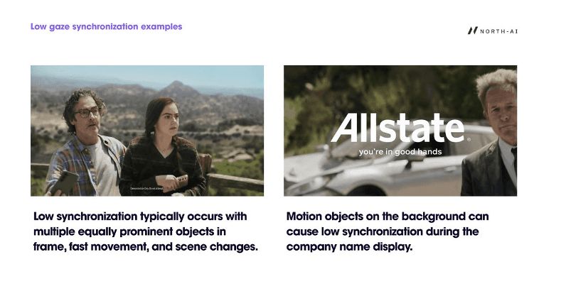 Fig. 12 — Low gaze synchronisation examples. Left: multiple people in frame with similarly weighted visual prominence. Right: moving background elements during brand name display (Allstate) pull attention away from the brand identifier. Both scenarios scatter gaze across the frame.