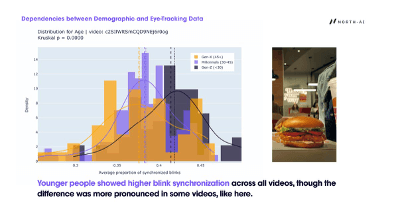 02 — Demographics affect blink synchronisation but not gaze patterns. Where people look and how they track video content is consistent across age, sex, and country. This means engagement measurement from eye-tracking is broadly generalisable. However, blink synchronisation — a measure of shared emotional reaction — does vary by demographic group, particularly by age. Younger audiences show higher synchronisation, indicating greater neural reactivity to advertising and socially relevant content.