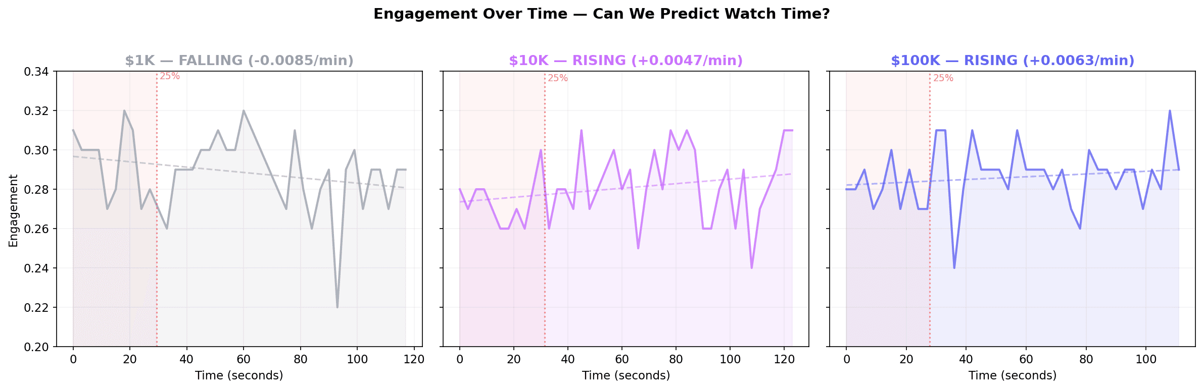 Rising engagement curve. While the $1K video's engagement declined over time and the $100K stayed flat, the $10K video actually built engagement through the middle — peaking around 78-84 seconds in. This is the rare pattern where viewers become more engaged as the video progresses, not less.