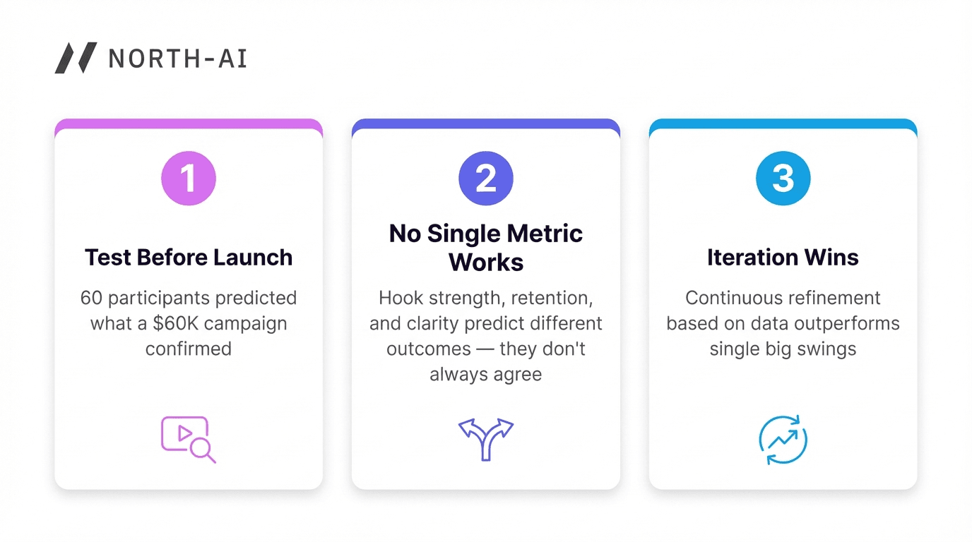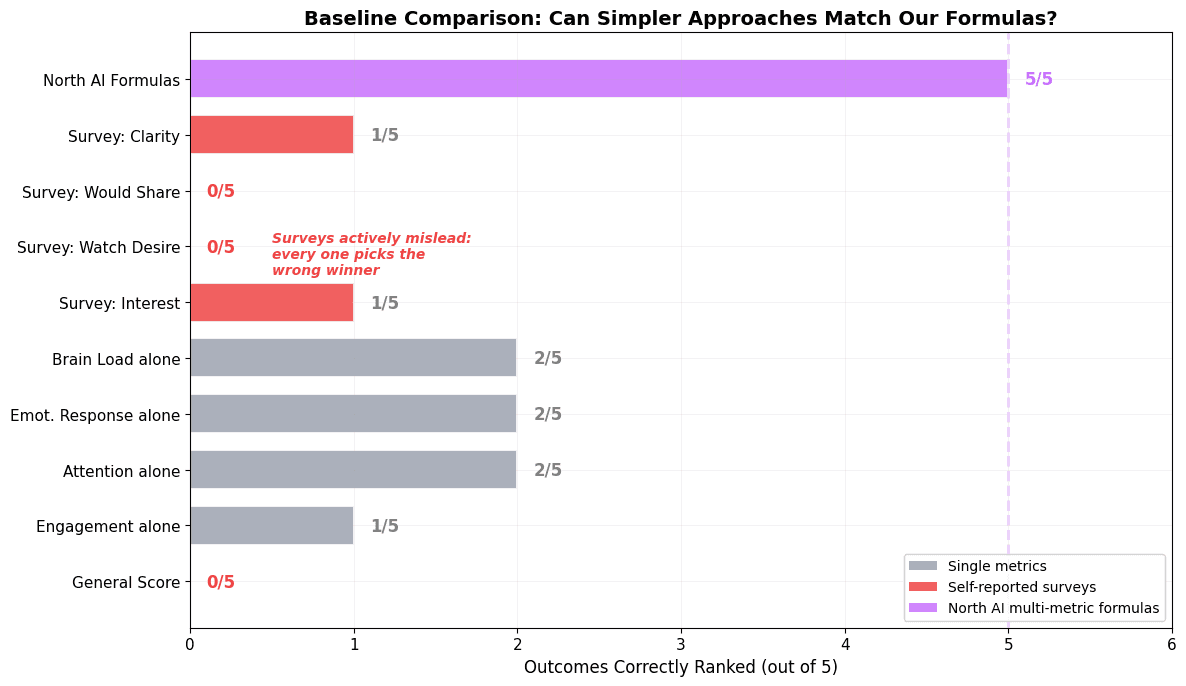 In this case study, North AI correctly rank-ordered all 6 campaign outcomes for Wistia's $60K video ad campaign using 60 participants and zero media spend. We measured simulated cognitive activity across four dimensions — engagement, attention, brain load, and emotional response — and built five formulas that each predicted a different campaign outcome. No simpler alternative matched more than 2 out of 5 outcomes. Every questionnaire metric picked the wrong winner — viewers said they preferred the $1K and $100K videos, but the $10K won every campaign metric. What people say they like and what actually converts are fundamentally different. This is one case study; we're building more benchmarks to validate the approach across different industries and video types.