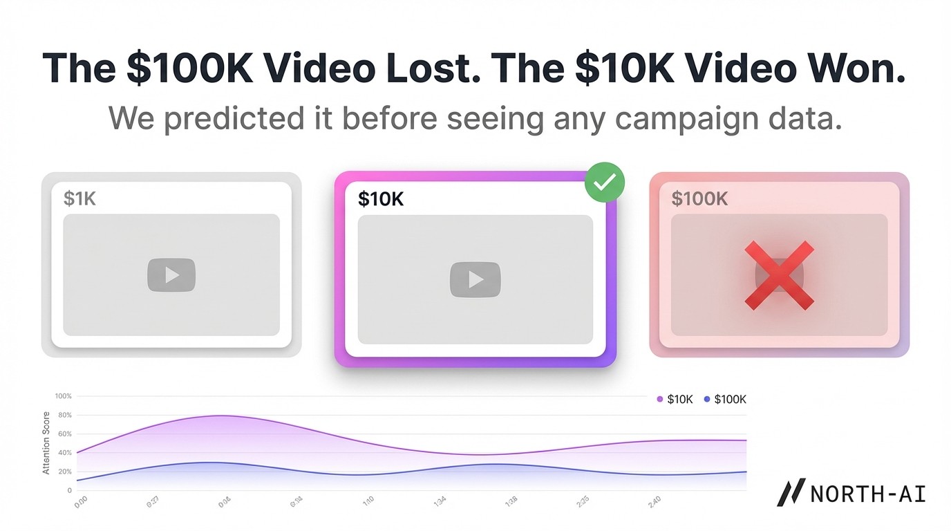 North AI uses simulated cognitive testing to predict which video creative will perform best — before you spend on media. Results in under 4 hours. Join the beta to see how we'd test your next campaign.