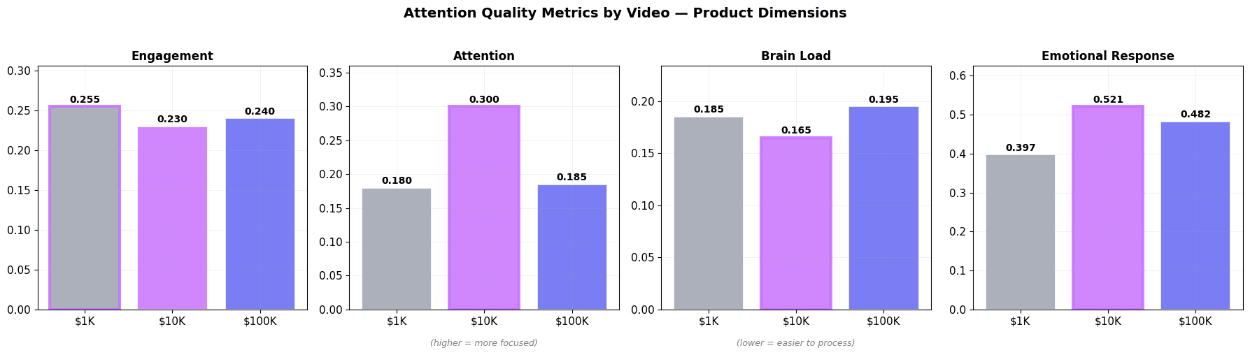 Message clarity — a combination of high attention focus (viewers locked onto the same elements), strong emotional alignment, and low brain load (ease of comprehension). The $10K video scored significantly higher on message clarity than the alternatives, matching its nearly 2x conversion rate advantage (1.36% vs 0.72-0.80%).