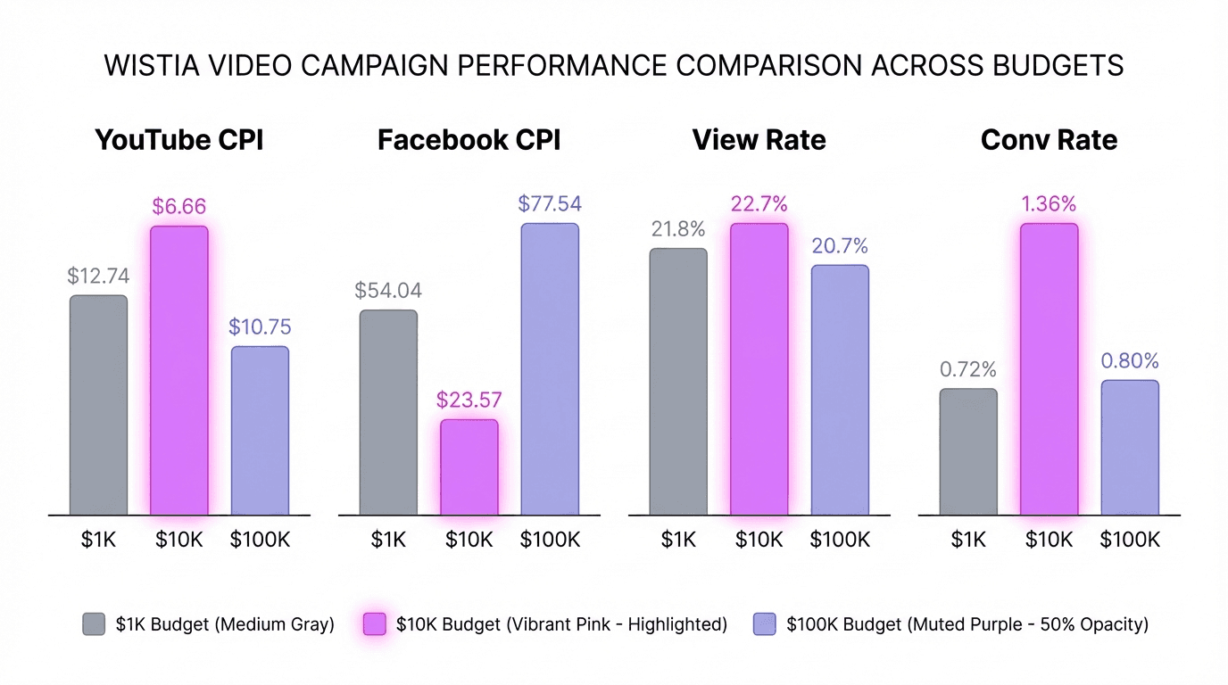 On YouTube, the $10K video delivered installs at $6.66 each. The $100K video? $10.75 — 61% more expensive per install. On Facebook, the gap was even wider: $23.57 versus $77.54.