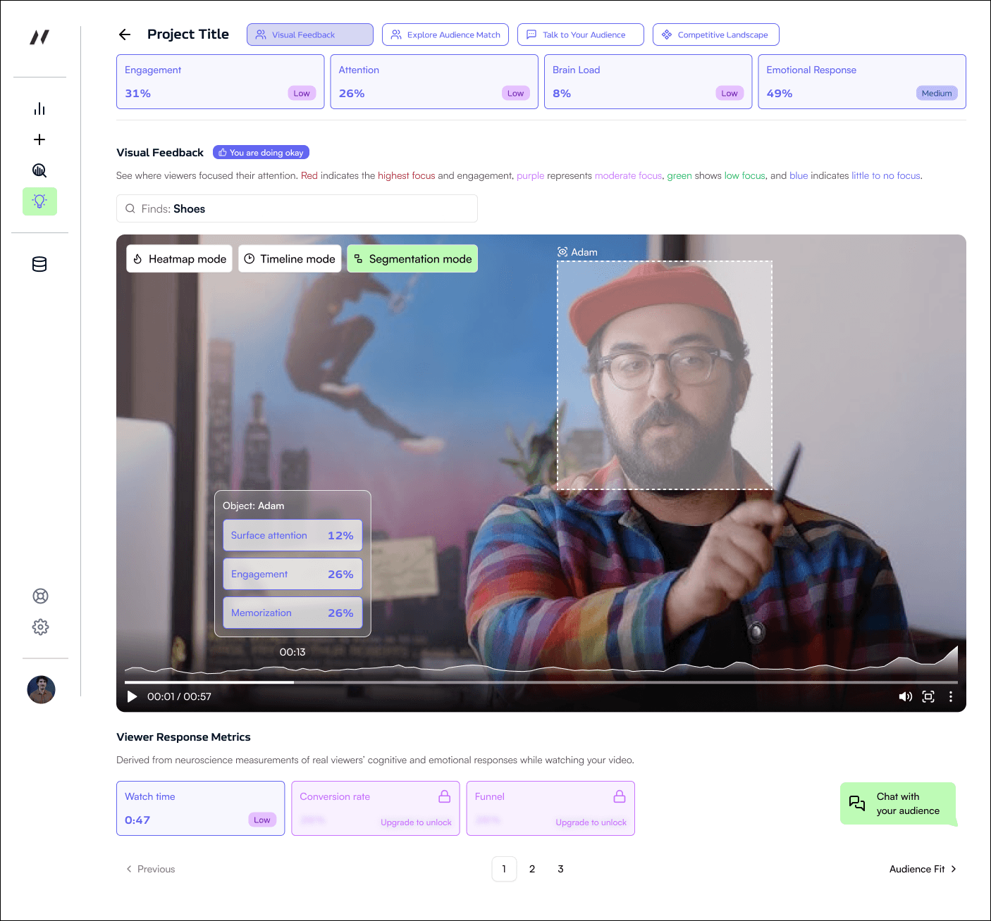 Each participant watched one of the three videos while our platform measured their simulated cognitive activity across four dimensions — engagement, attention, brain load, and emotional response — second by second. Real viewers. Real cognitive responses. Analyzed by AI in real time. No surveys. No self-reported opinions.