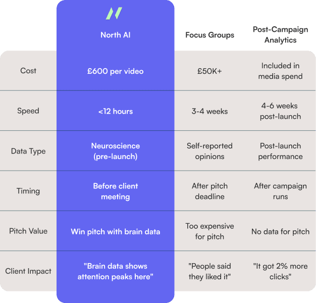 North AI gives you neuroscience-validated proof that your creative works—before you present to clients. Test concepts in <12 hours, win more pitches, reduce revisions.