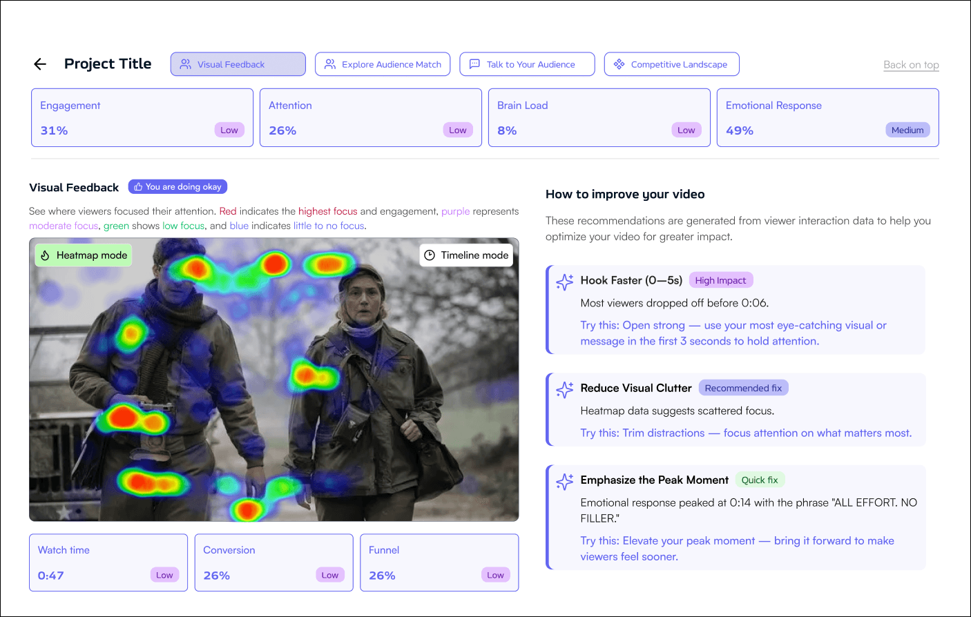 Data-backed suggestions on what to fix, why, and how. Turn brain data into actionable creative direction.