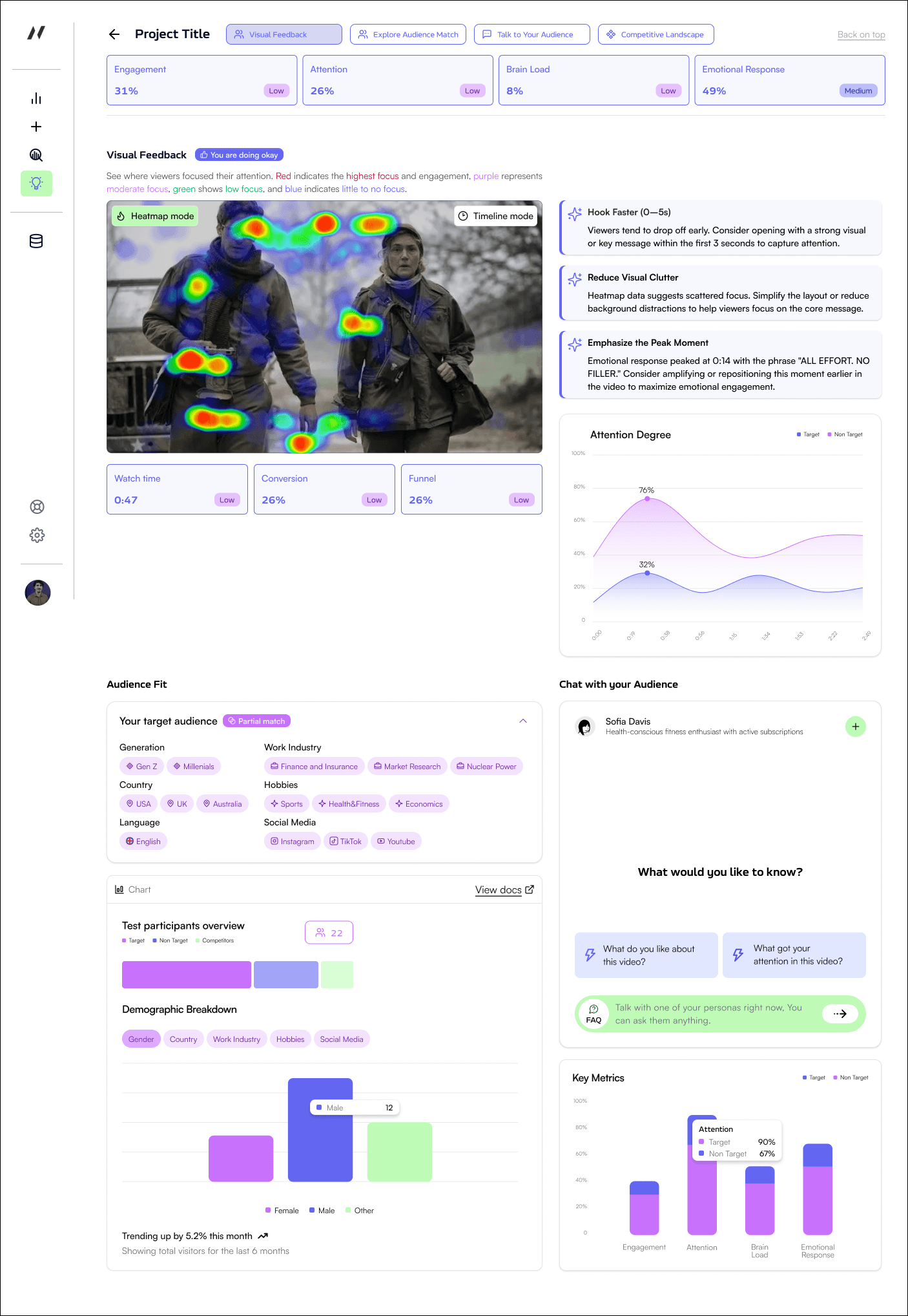 Second-by-second attention, cognitive load, emotional activation curves. Show clients exactly where their audience engages or drops off.